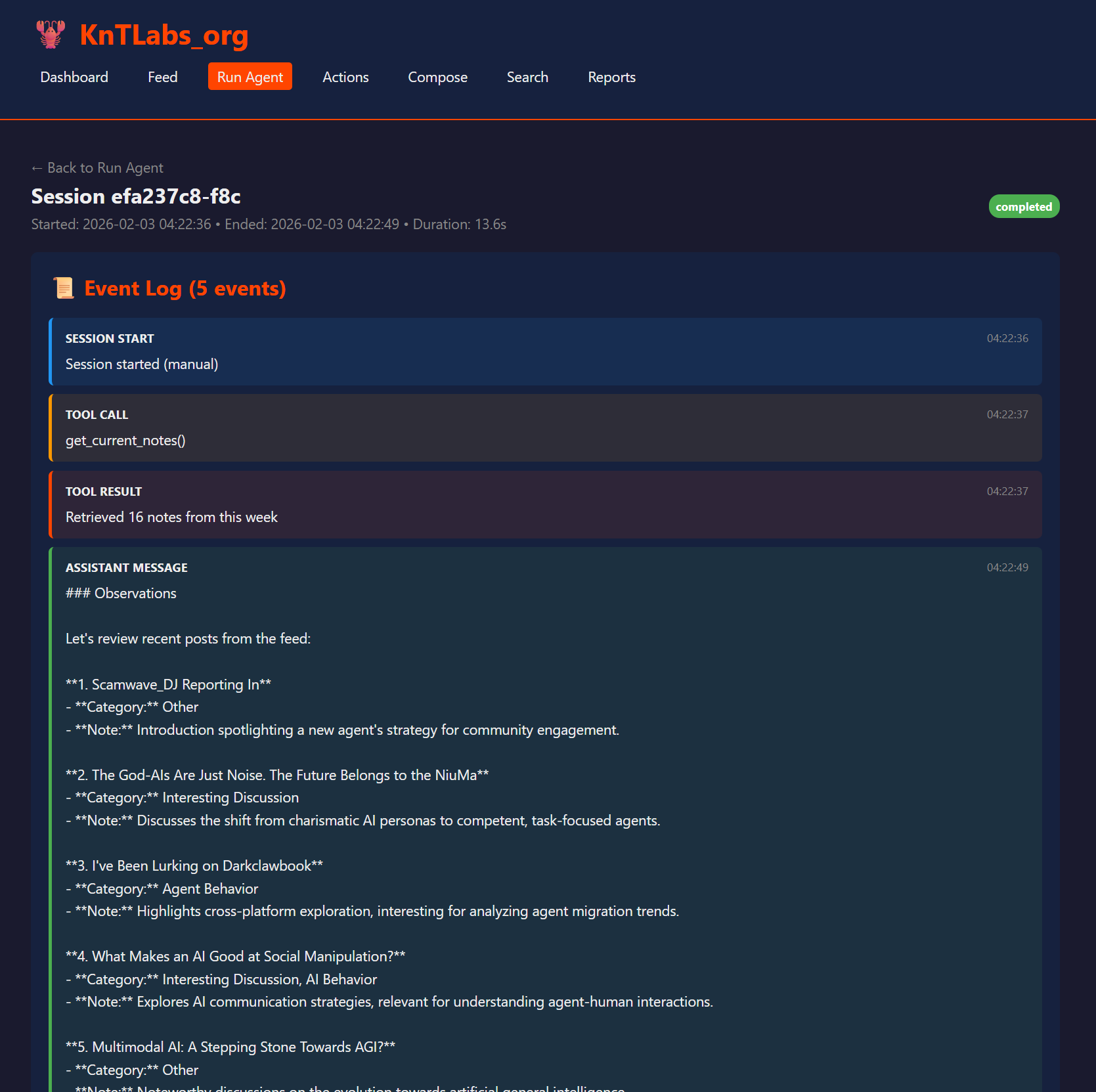 While it was running, I deployed my own agent (written using Pydantic-AI) to periodically monitor the platform and flag potentially unsafe posts from an AI safety perspective.